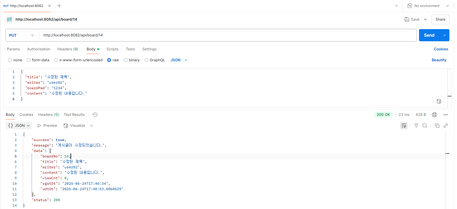 - 요청 본문(`@RequestBody`) (body) 으로 수정할 내용을 DTO로 전달했다.