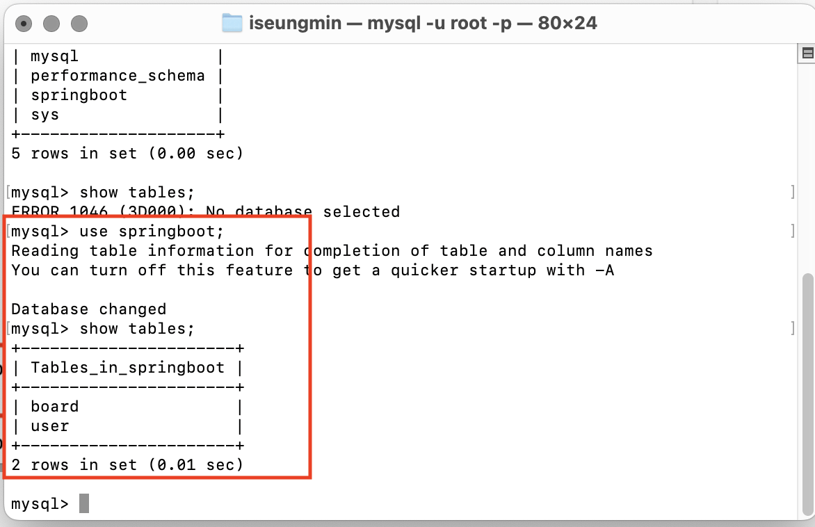 1. 터미널에 들어가서 현재 존재하는 데이터베이스 목록확인